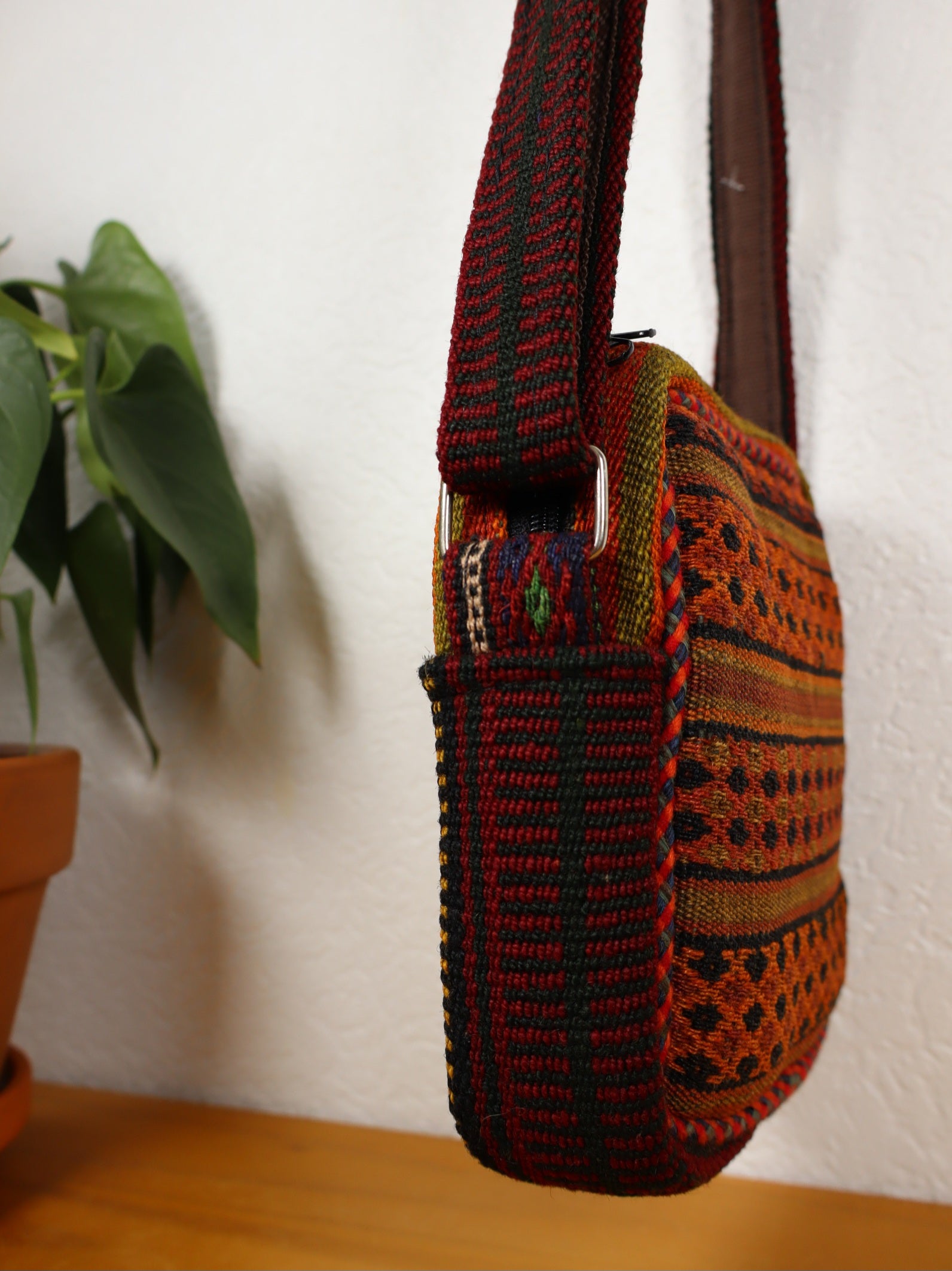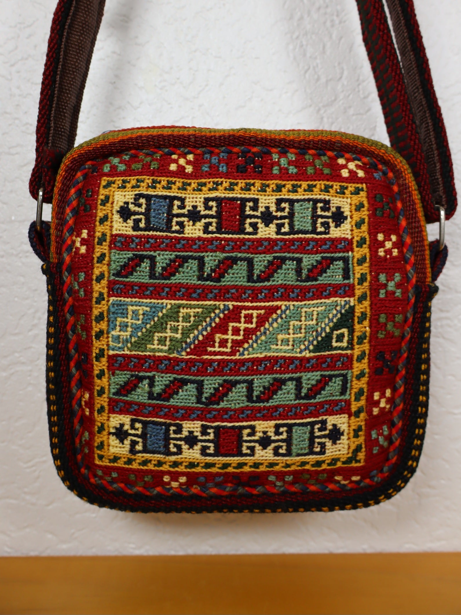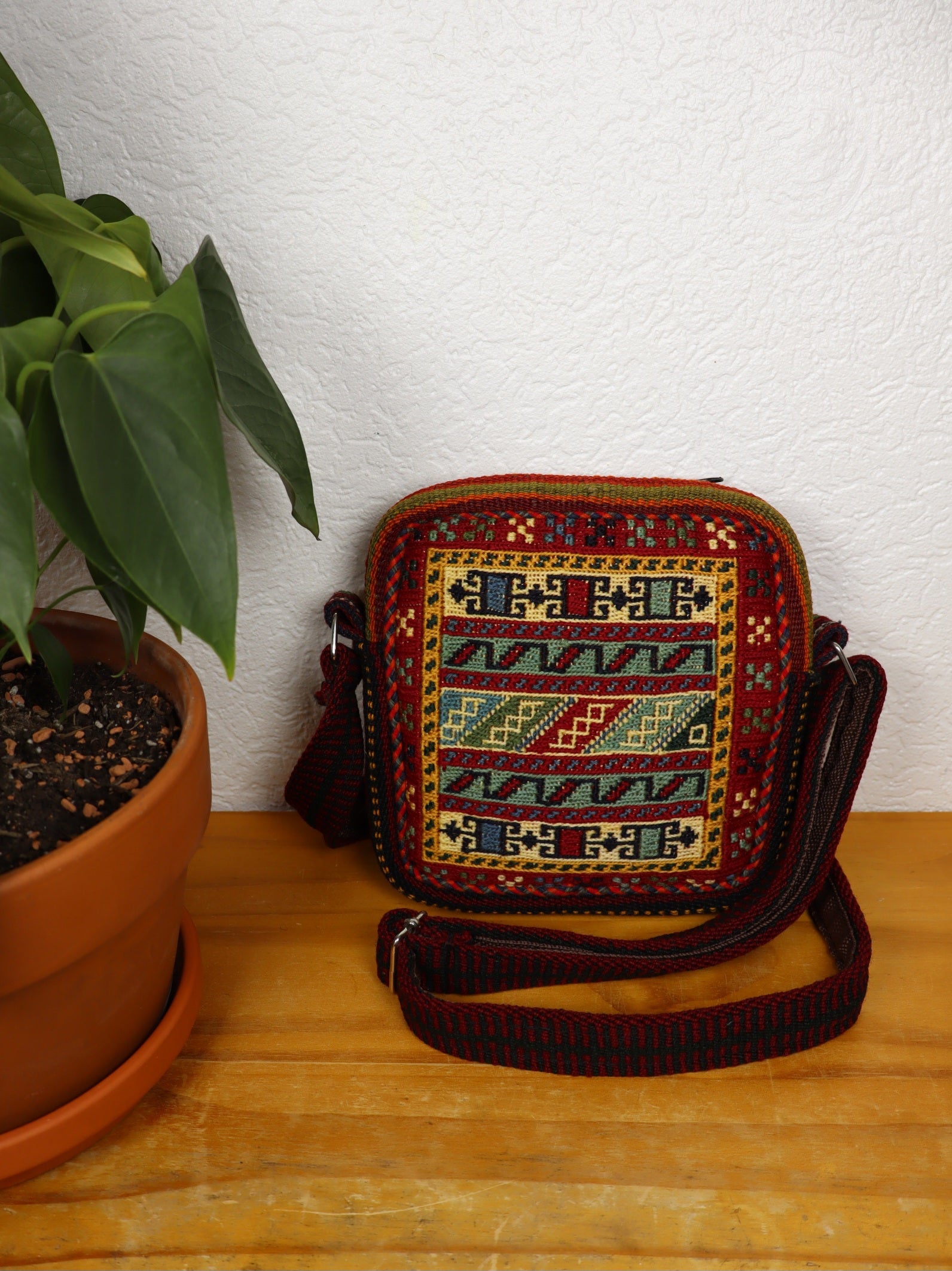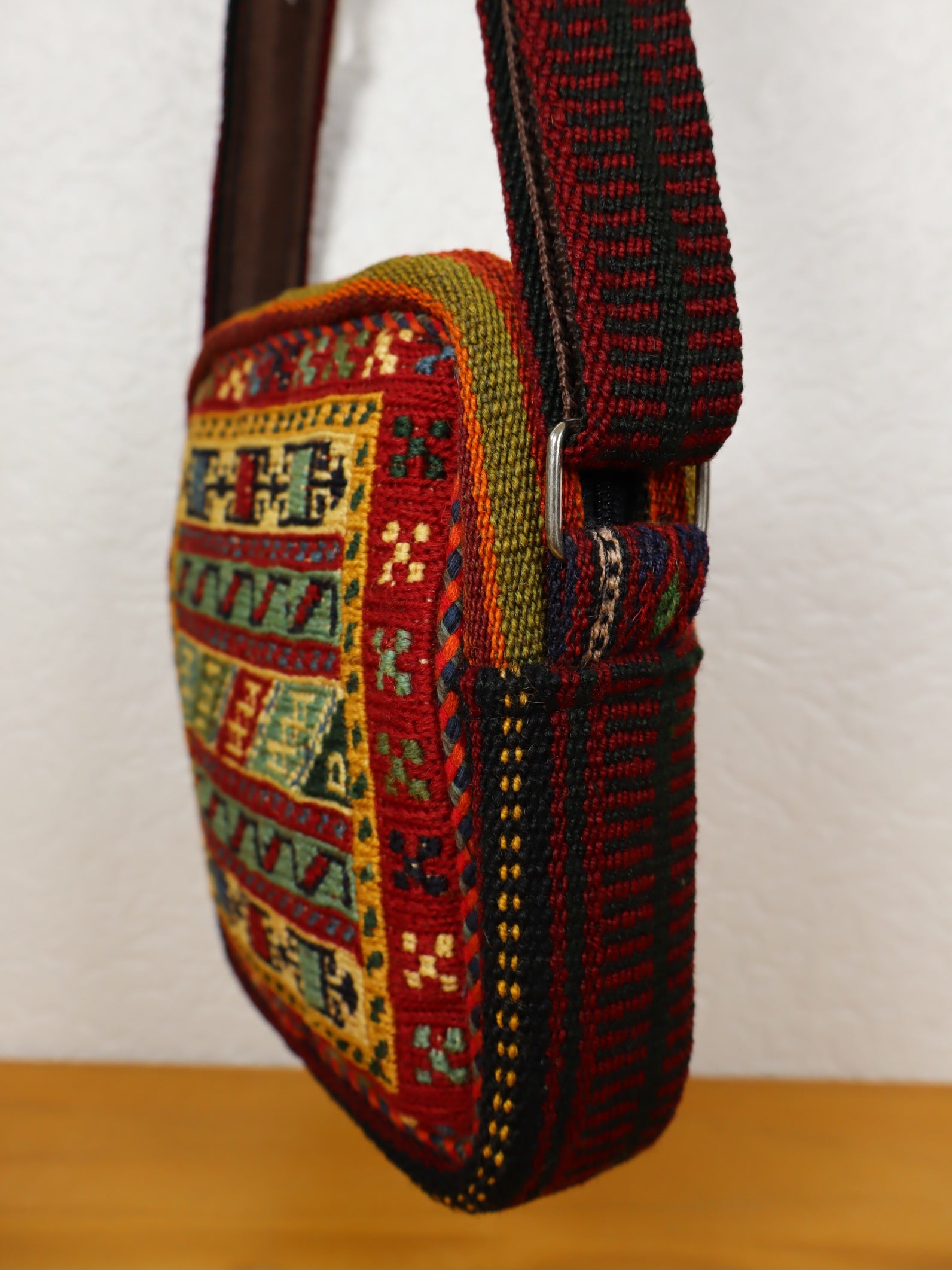 This unique, handmade shoulder bag made of high quality wool, handwoven from 60 year old Jajim and Sirjan kilim, offers a combination of tradition and high quality craftsmanship, dyed with natural plant dyes.